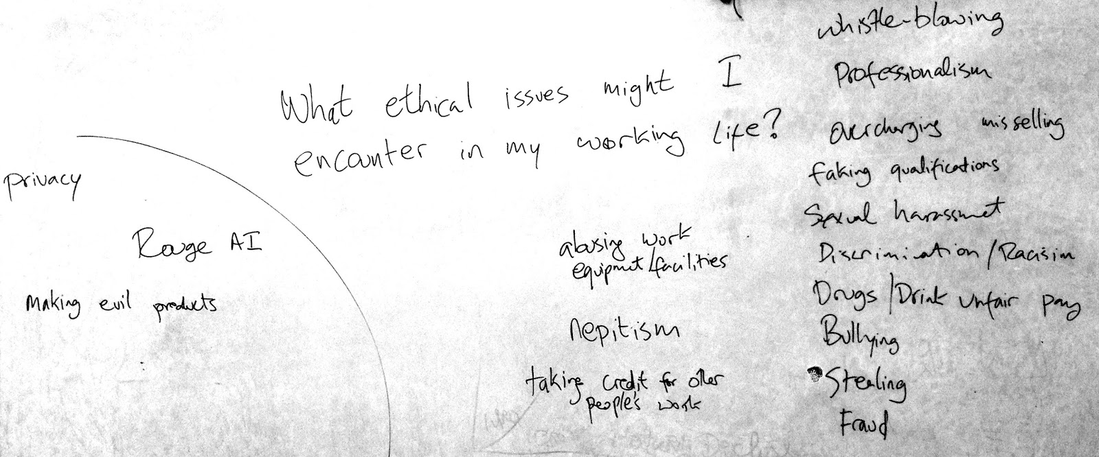 We looked at duty-based ethics, virtue ethics, situation ethics, ethics & ideology, moral relativism.