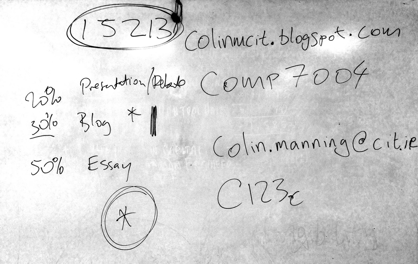 I explained how the assessment for this module will work. The most noteworthy aspect of this is that students will have to turn up to class if they want to get marks for their reflections on the class.